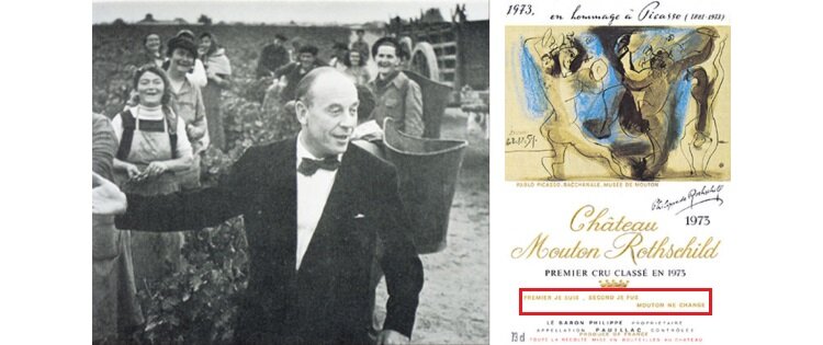 ムートン・ロッチルドを語るうえで欠かせないのが、芸術と哲学の融合です。1945年以降、毎年異なる著名画家が手掛けるラベルアートは、ワインを時代と共に語る文化的象徴となりました。また創造性と伝統を併せ持つこのシャトーの精神を体現する言葉が、「Mouton ne change(されどムートンは不変なり)」です。1855年の格付けで2級にとどまった際、ナタニエル男爵は「1級にはなれないが、2級には甘んじれぬ。ムートンはムートンなり」との言葉を残しました。彼の信念はフィリップ男爵に受け継がれ、長年の努力の末に1973年、ムートンは悲願の1級に昇格します。その年、ピカソのラベルに刻まれた「我1級なりぬ、かつて2級なりき、されどムートンは不変なり」は、シャトーの誇りと不屈の精神を象徴する言葉となりました。