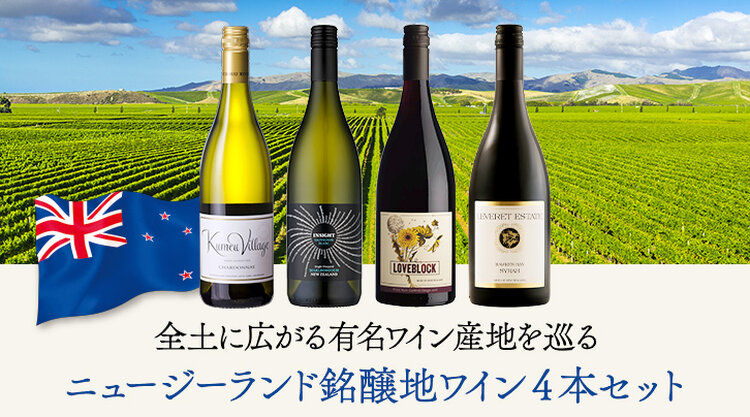 ニュージーランドには11の代表的なワイン産地があります。今回はその中から、押さえておきたい代表的なワインから新潮流のワインまで4アイテムをセレクト。熟した果実味とオーク香が見事に調和しているシャルドネ、ハーブやパッションフルーツのアロマが口いっぱいに広がるソーヴィニヨン・ブラン、黒系と赤系のベリーの豊かな果実味が心地よいピノ・ノワール、柔らな口あたりで熟成感を楽しめるシラーの4本。各産地を巡るように楽しむことができるワインセットです。