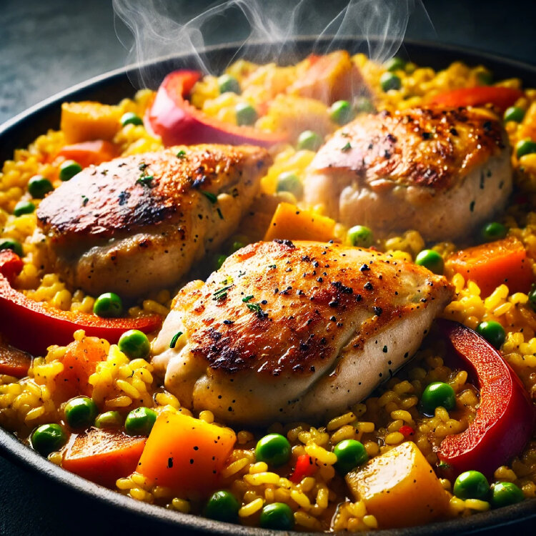 鶏肉を使ったパエリアは、ワインの果実味と酸味が鶏肉の柔らかな風味と見事に調和します。鶏肉のジューシーさと、ワインの豊かなボディが食事全体を引き立てます。