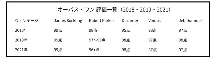 特筆すべきは、世界的な評論家ジェームス・サックリングが2018・2019・2021の3年連続で99点を与えたことです。オーパス・ワンのブドウ栽培と醸造における一貫した哲学と、ナパ・ヴァレーというテロワールの力を示しています。加えてロバート・パーカー、デキャンター、ヴィノス、ジェブ・ダナックといったメジャーなワイン評価誌からも軒並み高得点を獲得しました。各年それぞれに異なる表情を見せながらも共通して「偉大なオーパス・ワン」であることに疑いはありません。